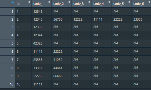 | 6 | 11111 | 22222 | NA | NA | NA |