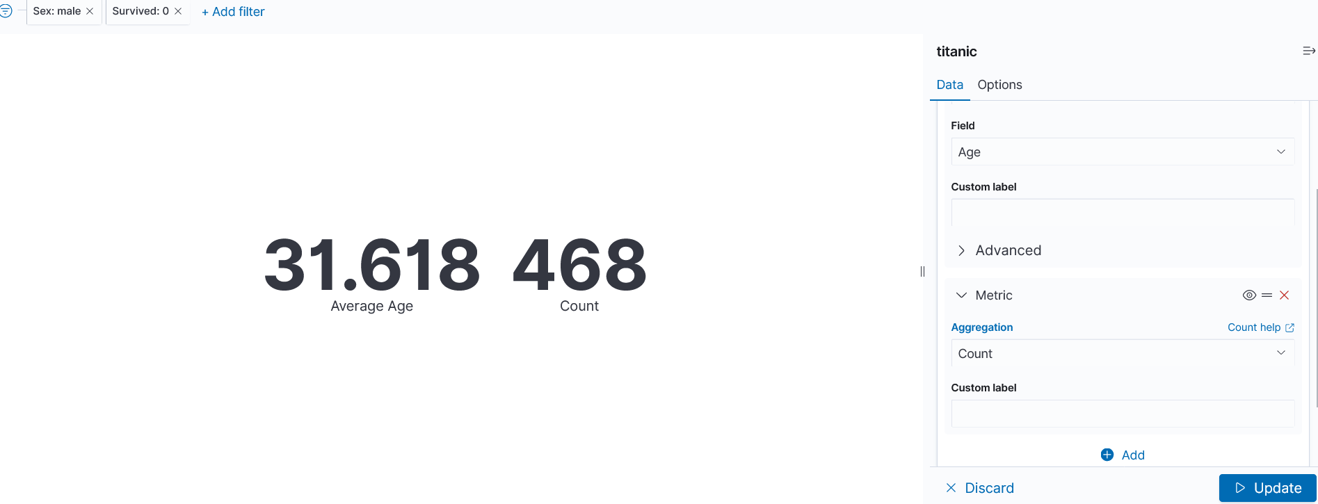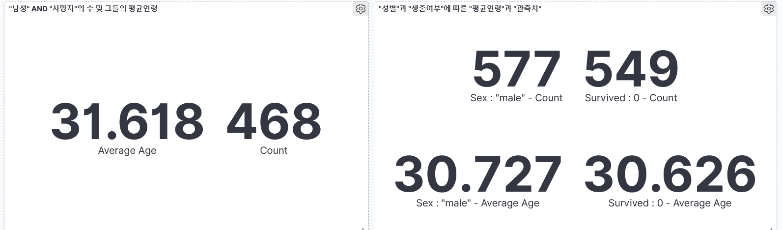 왼쪽패널은 "남성"이면서 "사망"한 사람의 평균연령과 "남성"이면서"사망"한 사람의 수