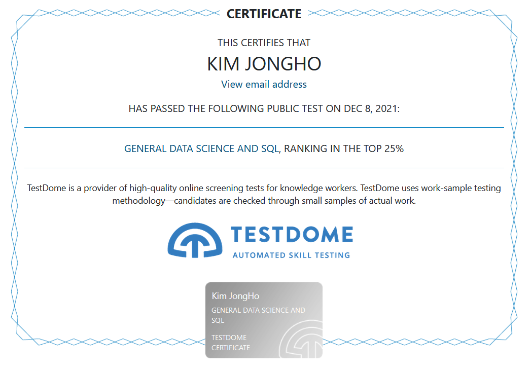 내가 이 General Data Science and SQL 유형의 상위 25%라며 인증서를 줬다.